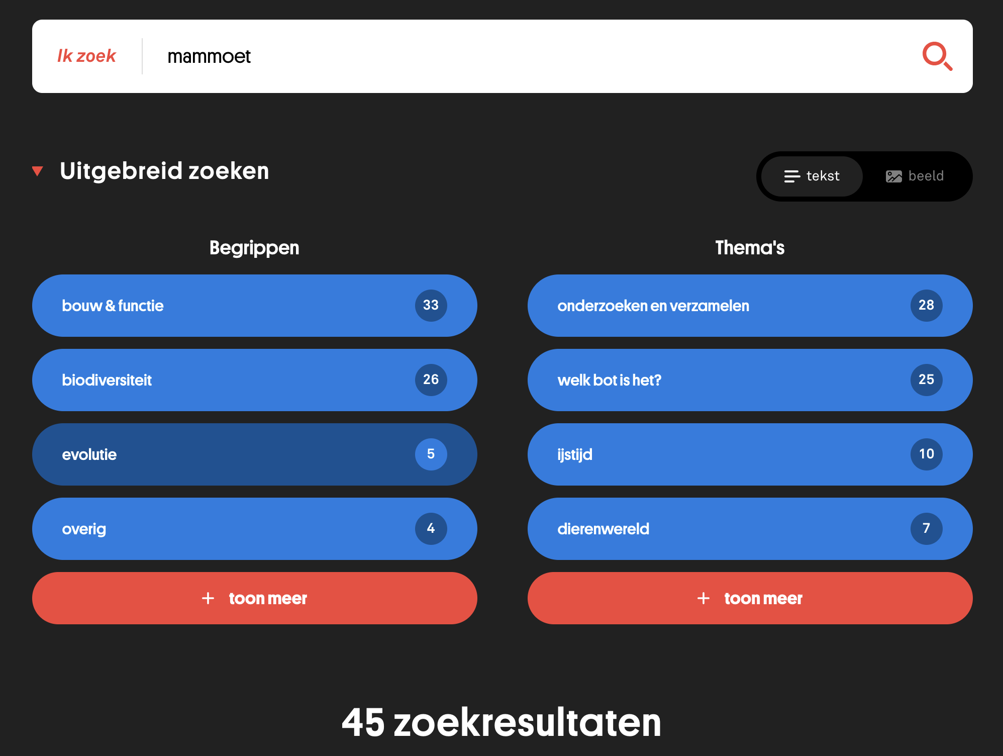 We geven hier meteen een voorbeeld: zoeken op mammoet. Allereerst kun je hier kiezen voor tekst of beeld. En bij tekst zit een Uitgebreid zoeken-mogelijkheid.